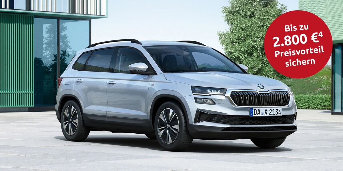 4. Preisvorteil für den Škoda Karoq Tour gegenüber der unverbindlichen Preisempfehlung der Škoda Auto Deutschland GmbH für vergleichbar ausgestattetes Serienmodell der Ausstattungslinie Selection. Der Verkaufspreis wird allein von uns festgesetzt.